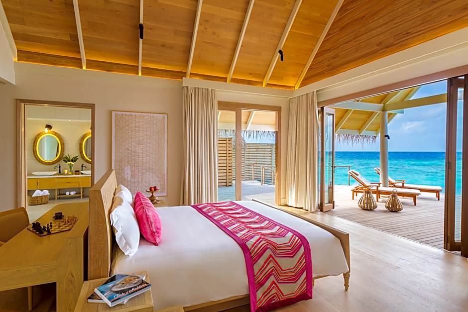 The room includes a package that includes: - Daily breakfast - A dedicated butler (full butler service) - Wifi internet in all villas and public areas - Use of snorkeling equipment during stay - Welcome gift - Bottle of champagne in-villa on arrival - Welcome fruit basket - Use of the private airport lounge on arrival - Gourmet in-villa turndown service - Early check in and late checkout (subject to availability) - A dedicated chef to customize all meals to guest preference - Private outdoor cinema on the deck during the stay - One private half-day excursion of guest’s choice during the stay - CIP welcome services (greet at airplane door and seamless immigration in private lounge at Male International Airport) on arrival and departure